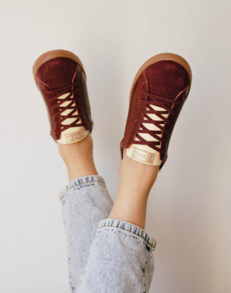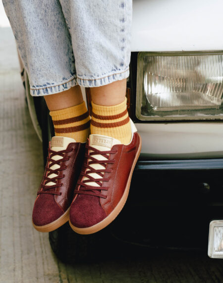 Estos tenis en tono vinotinto con punta en carnaza traen de vuelta lo clásico con un estilo que nunca pasa de moda. Los detalles en crema y la suela color caramelo completan un atuendo vintage que combina perfecto.