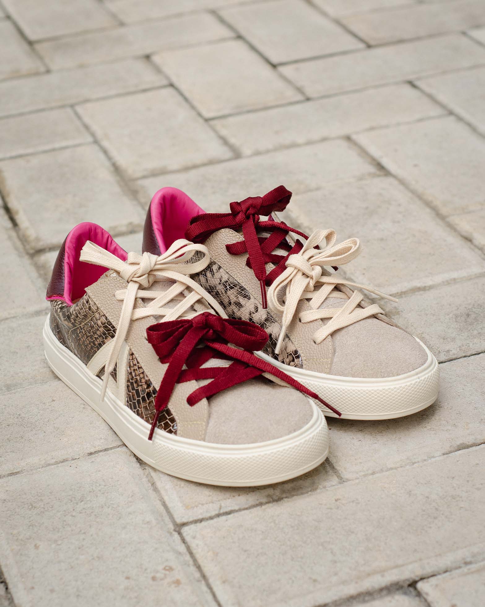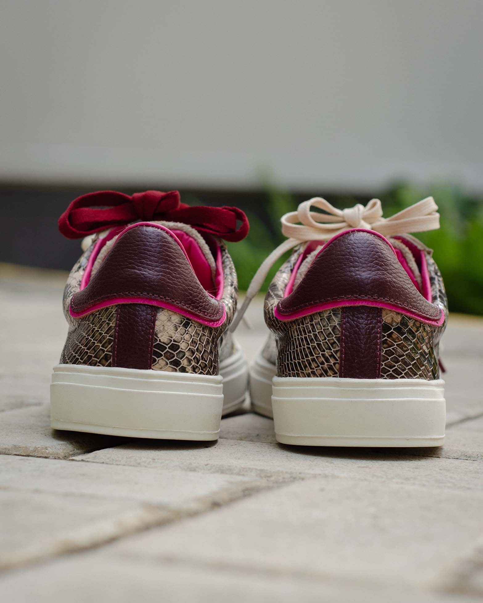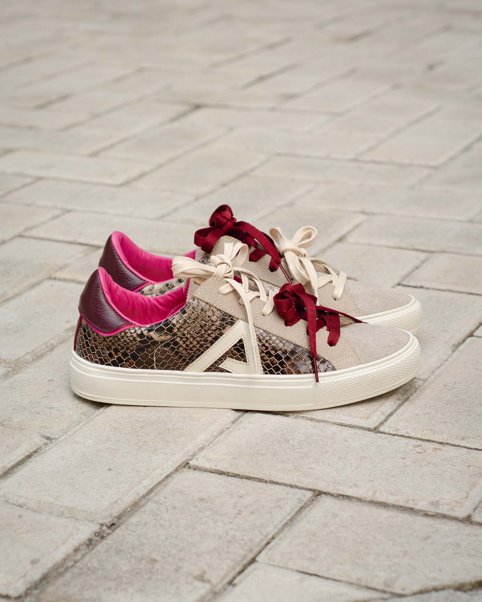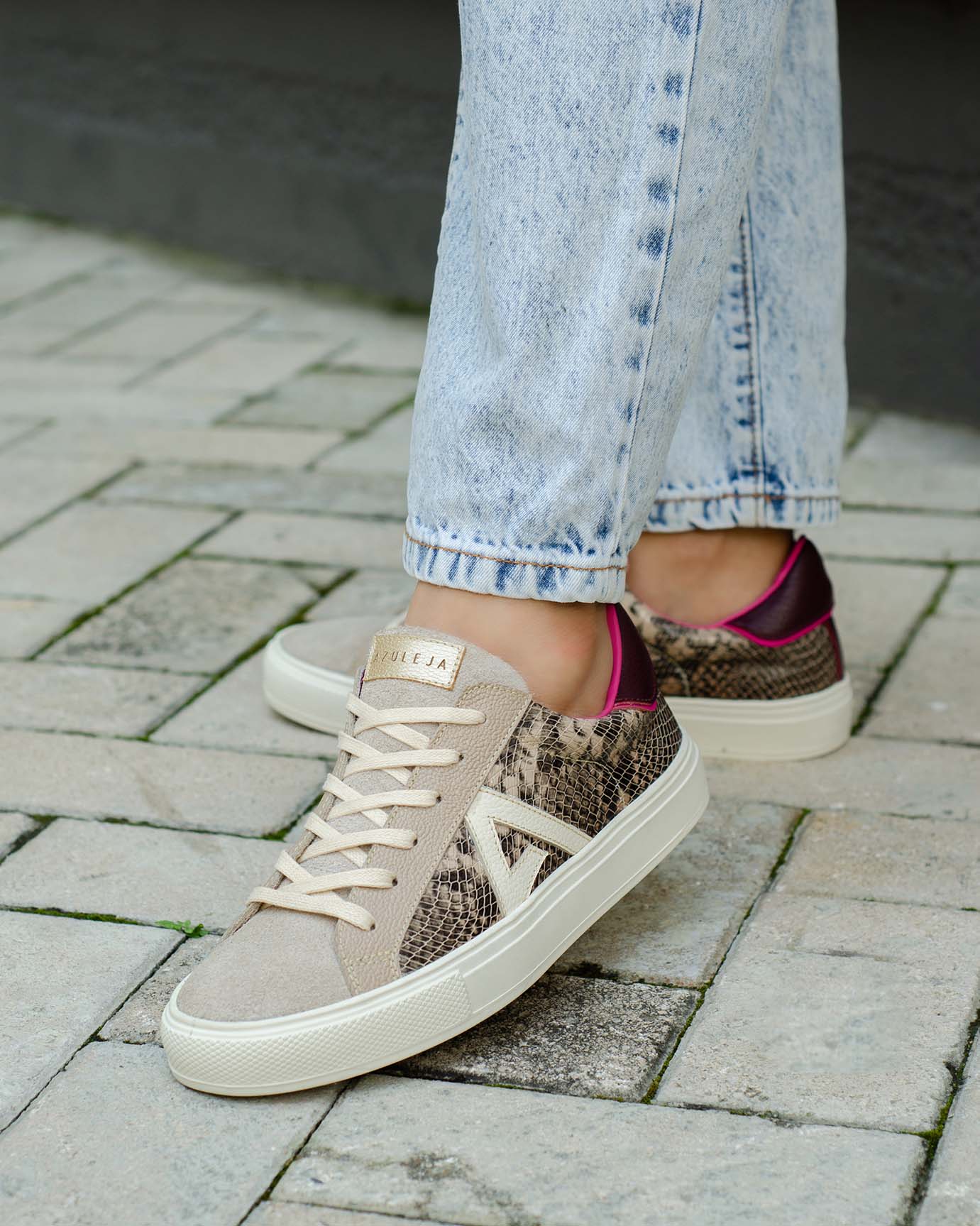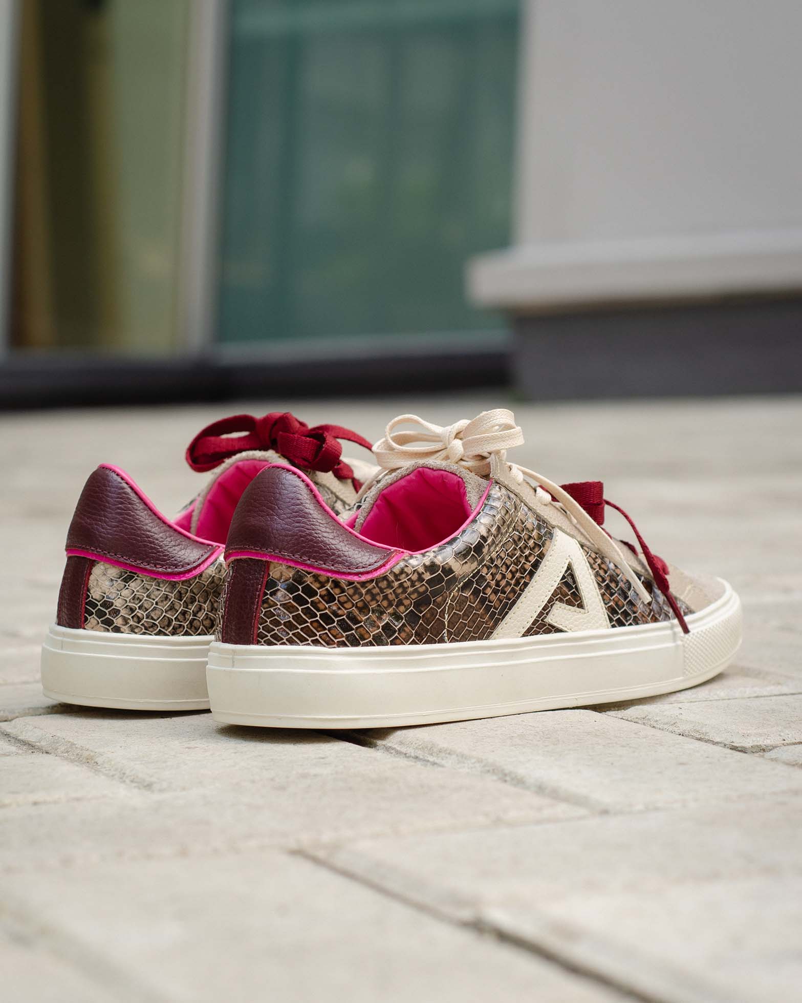 Estos tenis no son como cualquier par. Con un diseño en piel imitación snake con detalles en fucsia y vinotinto te harán destacar al instante. La icónica ‘A’ de Azuleja en el lateral les da ese toque auténtico y lleno de estilo que buscabas. Perfectos para darle personalidad a cualquier look casual y crear combinaciones únicas. Son cómodos, versátiles y modernos. ¡Camina con confianza y muestra tu lado más audaz con estos tenis únicos!